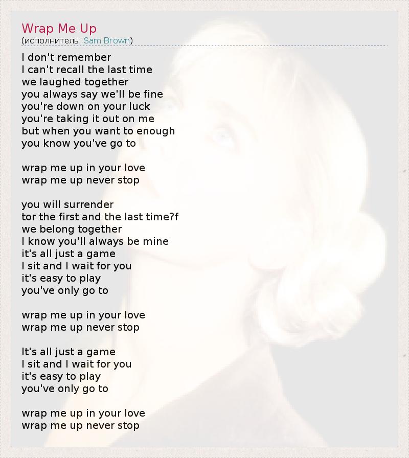 I don't remember I can't recall the last time we laughed together you always say we'll be fine you're down on your luck you're taking it out on me but when you want to enough you know you've go to wrap me up in your love wrap me up never stop you will surrender tor the first and the last time?f we belong together I know you'll always be mine it's all just a game I sit and I wait for you it's easy to play you've only go to wrap me up in your love wrap me up never stop It's all just a game I sit and I wait for you it's easy to play you've only go to wrap me up in your love wrap me up never stop