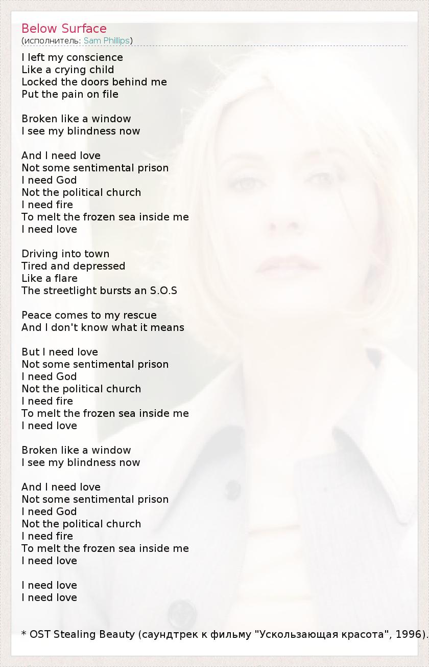 I left my conscience Like a crying child Locked the doors behind me Put the pain on file Broken like a window I see my blindness now And I need love Not some sentimental prison I need God Not the political church I need fire To melt the frozen sea inside me I need love Driving into town Tired and depressed Like a flare The streetlight bursts an S.O.S Peace comes to my rescue And I don't know what it means But I need love Not some sentimental prison I need God Not the political church I need fire To melt the frozen sea inside me I need love Broken like a window I see my blindness now And I need love Not some sentimental prison I need God Not the political church I need fire To melt the frozen sea inside me I need love I need love I need love * OST Stealing Beauty (саундтрек к фильму "Ускользающая красота", 1996).