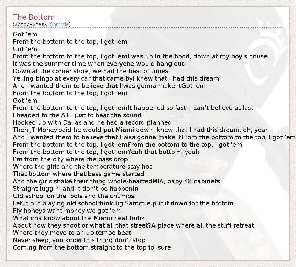 From the bottom to the top, I got 'emFrom the bottom to the top, I got 'em