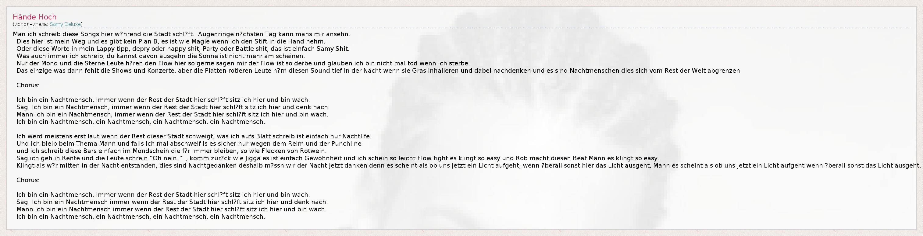 Это интересно:В 1997 году в Гамбурге, ФРГ, с выходом первой демо кассеты из серии Eimsbush Tapes начинается история одного из ярчайших немецкоговорящих МС Samy Deluxe. Эта кассета, разошедшаяся тиражом 10 тысяч экземпляров, содержала 8 песен группы Dynamite Deluxe, состоявшей из МС Сэмми Делюкса, диджея DJ Dynamite и битмейкера Tropf. Во многом эта кассета была большим прорывом в немецком хип-хопе и одновременно послужила началом... продолжение
