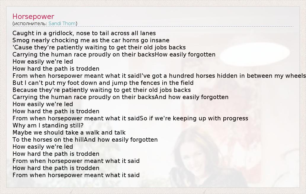 From when horsepower meant what it saidI've got a hundred horses hidden in between my wheels