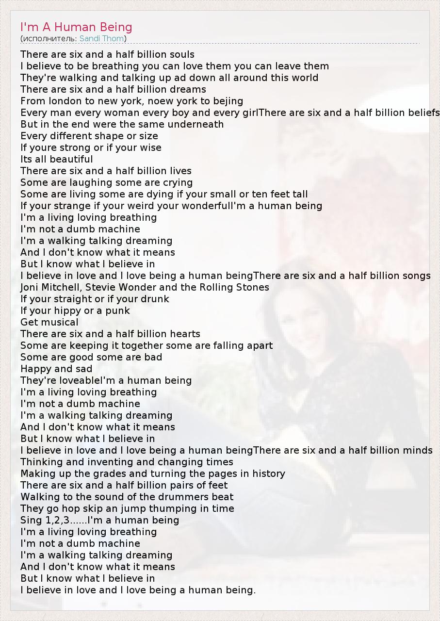 There are six and a half billion souls I believe to be breathing you can love them you can leave them They're walking and talking up ad down all around this world There are six and a half billion dreams From london to new york, noew york to bejing Every man every woman every boy and every girlThere are six and a half billion beliefs But in the end were the same underneath Every different shape or size If youre strong or if your wise Its all beautiful There are six and a half billion lives Some are laughing some are crying Some are living some are dying if your small or ten feet tall If your strange if your weird your wonderfulI'm a human being I'm a living loving breathing I'm not a dumb machine I'm a walking talking dreaming And I don't know what it means But I know what I believe in I believe in love and I love being a human beingThere are six and a half billion songs Joni Mitchell, Stevie Wonder and the Rolling Stones If your straight or if your drunk If your hippy or a punk Get musical There are six and a half billion hearts Some are keeping it together some are falling apart Some are good some are bad Happy and sad They're loveableI'm a human being I'm a living loving breathing I'm not a dumb machine I'm a walking talking dreaming And I don't know what it means But I know what I believe in I believe in love and I love being a human beingThere are six and a half billion minds Thinking and inventing and changing times Making up the grades and turning the pages in history There are six and a half billion pairs of feet Walking to the sound of the drummers beat They go hop skip an jump thumping in time Sing 1,2,3......I'm a human being I'm a living loving breathing I'm not a dumb machine I'm a walking talking dreaming And I don't know what it means But I know what I believe in I believe in love and I love being a human being.