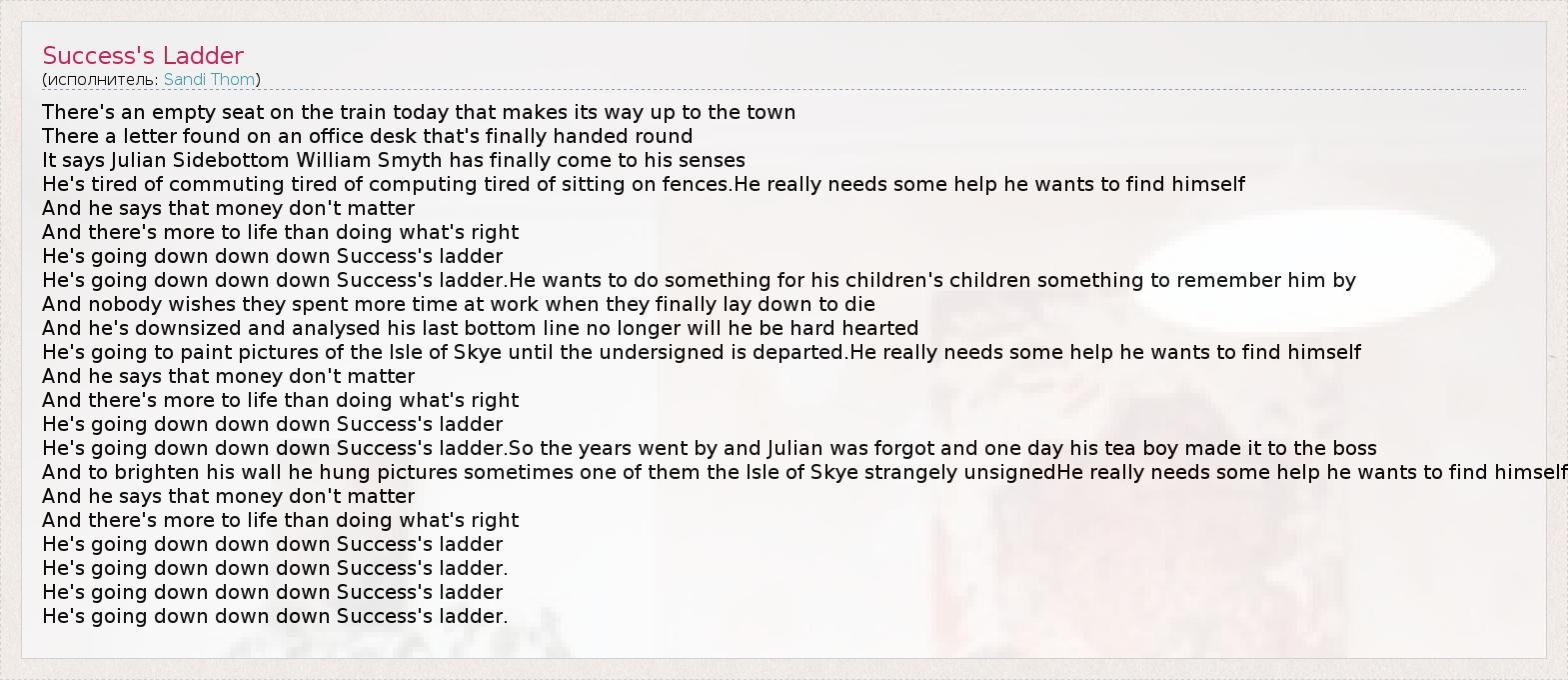 There's an empty seat on the train today that makes its way up to the town There a letter found on an office desk that's finally handed round It says Julian Sidebottom William Smyth has finally come to his senses He's tired of commuting tired of computing tired of sitting on fences.He really needs some help he wants to find himself And he says that money don't matter And there's more to life than doing what's right He's going down down down Success's ladder He's going down down down Success's ladder.He wants to do something for his children's children something to remember him by And nobody wishes they spent more time at work when they finally lay down to die And he's downsized and analysed his last bottom line no longer will he be hard hearted He's going to paint pictures of the Isle of Skye until the undersigned is departed.He really needs some help he wants to find himself And he says that money don't matter And there's more to life than doing what's right He's going down down down Success's ladder He's going down down down Success's ladder.So the years went by and Julian was forgot and one day his tea boy made it to the boss And to brighten his wall he hung pictures sometimes one of them the Isle of Skye strangely unsignedHe really needs some help he wants to find himself And he says that money don't matter And there's more to life than doing what's right He's going down down down Success's ladder He's going down down down Success's ladder. He's going down down down Success's ladder He's going down down down Success's ladder.