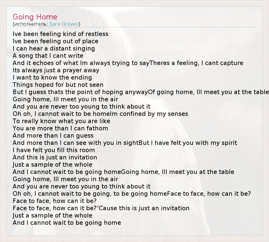 And I cannot wait to be going homeGoing home, Ill meet you at the table