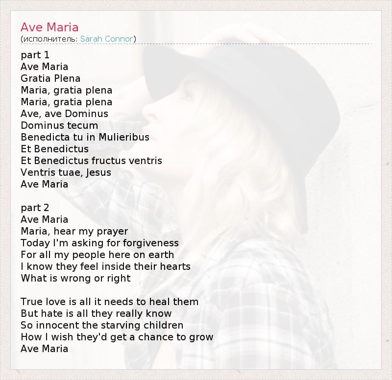 Радуйся, Мария, Благодати полная. Мария, благодати полная. Мария, благодати полная. Радуйся, радуйся Господь. Господь с Тобою, Благословенна Ты между женами, И благословен, И благословен плод чрева, Чрева Твоего, Иисус. Радуйся, Мария. Радуйся, Мария. Мария, услышь мою молитву, Сегодня Я прошу прощения За всех моих людей здесь, на Земле. Я знаю, они чувствуют сердцем, Что правильно, а что нет. Истинная любовь – всё, что нужно, чтобы исцелить их. Но ненависть – это всё, что они на самом деле знают. Безгрешные голодающие дети, Как я хочу, чтобы они получили шанс вырасти. Радуйся, Мария.