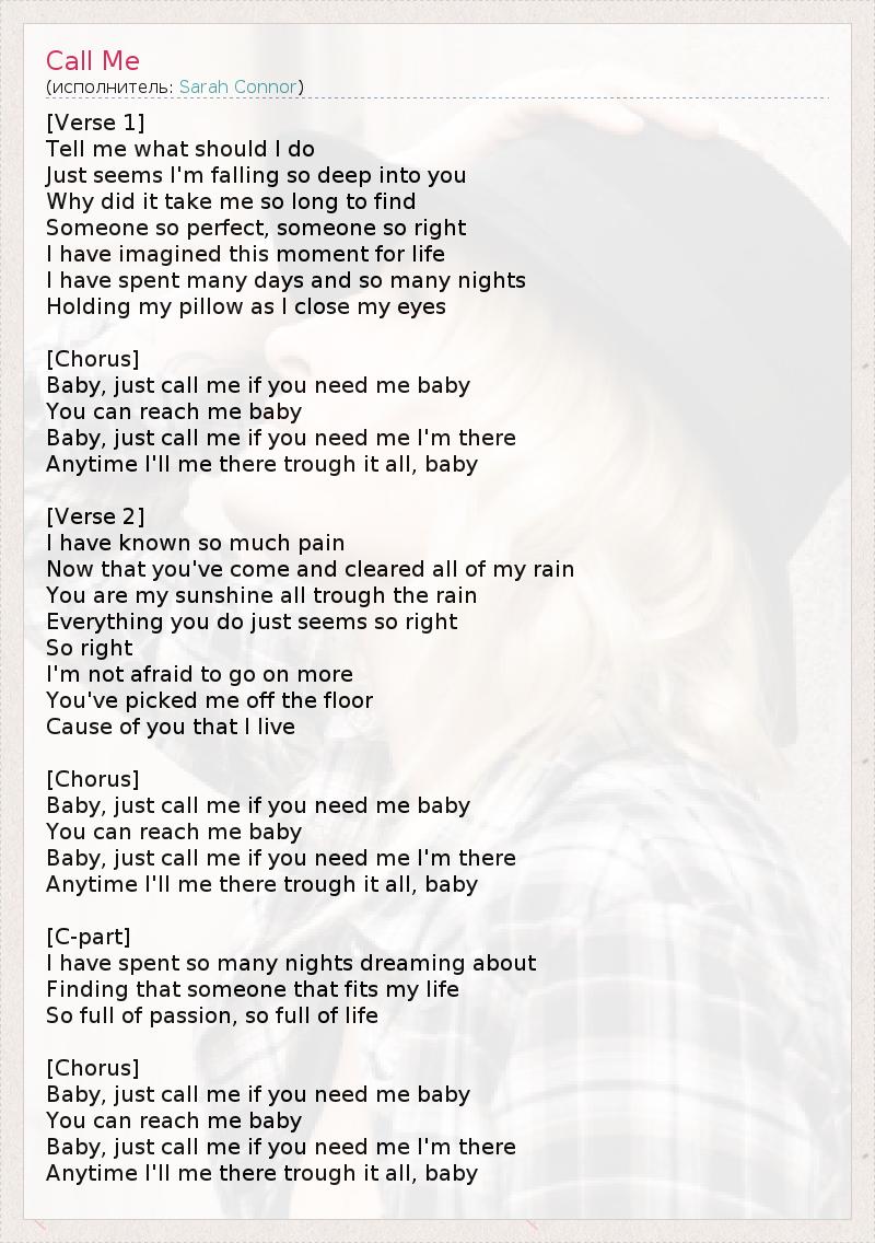 [Verse 1] Tell me what should I do Just seems I'm falling so deep into you Why did it take me so long to find Someone so perfect, someone so right I have imagined this moment for life I have spent many days and so many nights Holding my pillow as I close my eyes [Chorus] Baby, just call me if you need me baby You can reach me baby Baby, just call me if you need me I'm there Anytime I'll me there trough it all, baby [Verse 2] I have known so much pain Now that you've come and cleared all of my rain You are my sunshine all trough the rain Everything you do just seems so right So right I'm not afraid to go on more You've picked me off the floor Cause of you that I live [Chorus] Baby, just call me if you need me baby You can reach me baby Baby, just call me if you need me I'm there Anytime I'll me there trough it all, baby [C-part] I have spent so many nights dreaming about Finding that someone that fits my life So full of passion, so full of life [Chorus] Baby, just call me if you need me baby You can reach me baby Baby, just call me if you need me I'm there Anytime I'll me there trough it all, baby