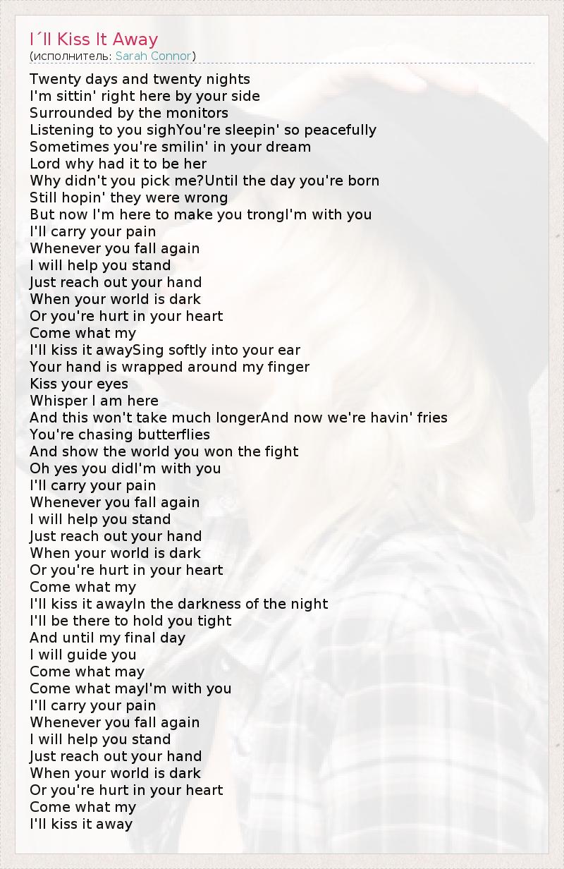Twenty days and twenty nights I'm sittin' right here by your side Surrounded by the monitors Listening to you sighYou're sleepin' so peacefully Sometimes you're smilin' in your dream Lord why had it to be her Why didn't you pick me?Until the day you're born Still hopin' they were wrong But now I'm here to make you trongI'm with you I'll carry your pain Whenever you fall again I will help you stand Just reach out your hand When your world is dark Or you're hurt in your heart Come what my I'll kiss it awaySing softly into your ear Your hand is wrapped around my finger Kiss your eyes Whisper I am here And this won't take much longerAnd now we're havin' fries You're chasing butterflies And show the world you won the fight Oh yes you didI'm with you I'll carry your pain Whenever you fall again I will help you stand Just reach out your hand When your world is dark Or you're hurt in your heart Come what my I'll kiss it awayIn the darkness of the night I'll be there to hold you tight And until my final day I will guide you Come what may Come what mayI'm with you I'll carry your pain Whenever you fall again I will help you stand Just reach out your hand When your world is dark Or you're hurt in your heart Come what my I'll kiss it away