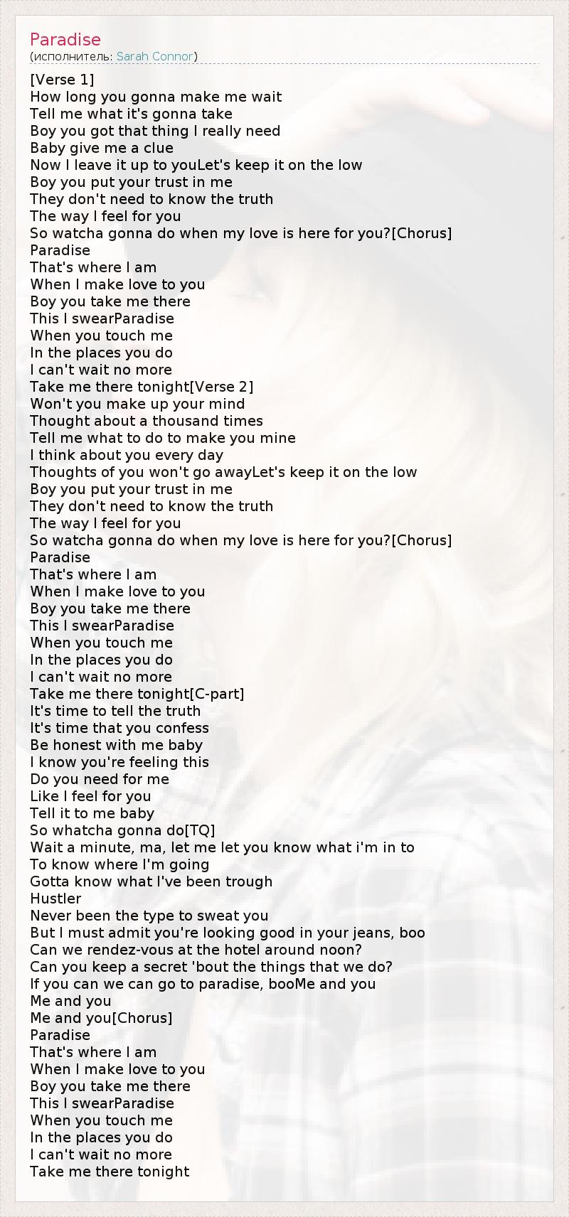 [Verse 1] How long you gonna make me wait Tell me what it's gonna take Boy you got that thing I really need Baby give me a clue Now I leave it up to youLet's keep it on the low Boy you put your trust in me They don't need to know the truth The way I feel for you So watcha gonna do when my love is here for you?[Chorus] Paradise That's where I am When I make love to you Boy you take me there This I swearParadise When you touch me In the places you do I can't wait no more Take me there tonight[Verse 2] Won't you make up your mind Thought about a thousand times Tell me what to do to make you mine I think about you every day Thoughts of you won't go awayLet's keep it on the low Boy you put your trust in me They don't need to know the truth The way I feel for you So watcha gonna do when my love is here for you?[Chorus] Paradise That's where I am When I make love to you Boy you take me there This I swearParadise When you touch me In the places you do I can't wait no more Take me there tonight[C-part] It's time to tell the truth It's time that you confess Be honest with me baby I know you're feeling this Do you need for me Like I feel for you Tell it to me baby So whatcha gonna do[TQ] Wait a minute, ma, let me let you know what i'm in to To know where I'm going Gotta know what I've been trough Hustler Never been the type to sweat you But I must admit you're looking good in your jeans, boo Can we rendez-vous at the hotel around noon? Can you keep a secret 'bout the things that we do? If you can we can go to paradise, booMe and you Me and you Me and you[Chorus] Paradise That's where I am When I make love to you Boy you take me there This I swearParadise When you touch me In the places you do I can't wait no more Take me there tonight