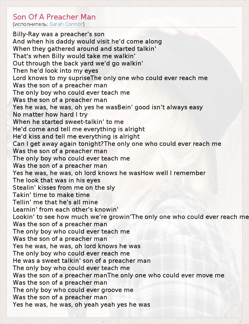 Billy-Ray was a preacher's son And when his daddy would visit he'd come along When they gathered around and started talkin' That's when Billy would take me walkin' Out through the back yard we'd go walkin' Then he'd look into my eyes Lord knows to my supriseThe only one who could ever reach me Was the son of a preacher man The only boy who could ever teach me Was the son of a preacher man Yes he was, he was, oh yes he wasBein' good isn't always easy No matter how hard I try When he started sweet-talkin' to me He'd come and tell me everything is alright He'd kiss and tell me everything is alright Can I get away again tonight?The only one who could ever reach me Was the son of a preacher man The only boy who could ever teach me Was the son of a preacher man Yes he was, he was, oh lord knows he wasHow well I remember The look that was in his eyes Stealin' kisses from me on the sly Takin' time to make time Tellin' me that he's all mine Learnin' from each other's knowin' Lookin' to see how much we're growin'The only one who could ever reach me Was the son of a preacher man The only boy who could ever teach me Was the son of a preacher man Yes he was, he was, oh lord knows he was The only boy who could ever reach me He was a sweet talkin' son of a preacher man The only boy who could ever teach me Was the son of a preacher manThe only one who could ever move me Was the son of a preacher man The only boy who could ever groove me Was the son of a preacher man Yes he was, he was, oh yeah yeah yes he was