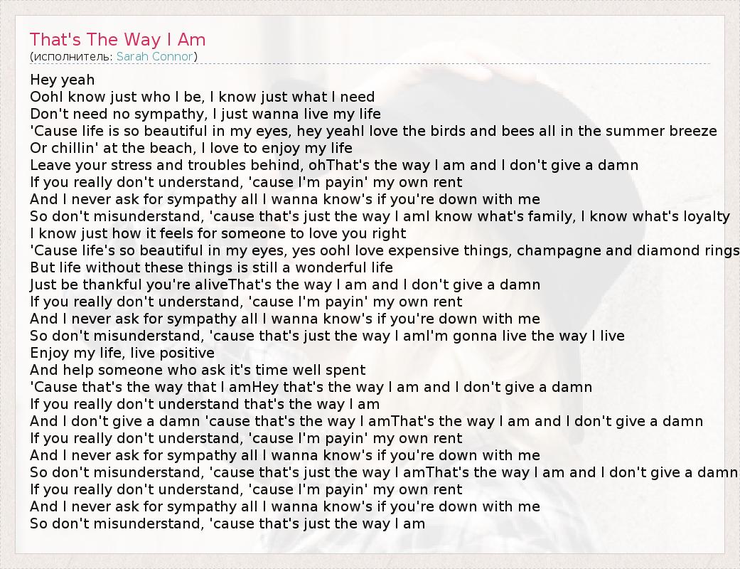 Hey yeah OohI know just who I be, I know just what I need Don't need no sympathy, I just wanna live my life 'Cause life is so beautiful in my eyes, hey yeahI love the birds and bees all in the summer breeze Or chillin' at the beach, I love to enjoy my life Leave your stress and troubles behind, ohThat's the way I am and I don't give a damn If you really don't understand, 'cause I'm payin' my own rent And I never ask for sympathy all I wanna know's if you're down with me So don't misunderstand, 'cause that's just the way I amI know what's family, I know what's loyalty I know just how it feels for someone to love you right 'Cause life's so beautiful in my eyes, yes oohI love expensive things, champagne and diamond rings But life without these things is still a wonderful life Just be thankful you're aliveThat's the way I am and I don't give a damn If you really don't understand, 'cause I'm payin' my own rent And I never ask for sympathy all I wanna know's if you're down with me So don't misunderstand, 'cause that's just the way I amI'm gonna live the way I live Enjoy my life, live positive And help someone who ask it's time well spent 'Cause that's the way that I amHey that's the way I am and I don't give a damn If you really don't understand that's the way I am And I don't give a damn 'cause that's the way I amThat's the way I am and I don't give a damn If you really don't understand, 'cause I'm payin' my own rent And I never ask for sympathy all I wanna know's if you're down with me So don't misunderstand, 'cause that's just the way I amThat's the way I am and I don't give a damn If you really don't understand, 'cause I'm payin' my own rent And I never ask for sympathy all I wanna know's if you're down with me So don't misunderstand, 'cause that's just the way I am
