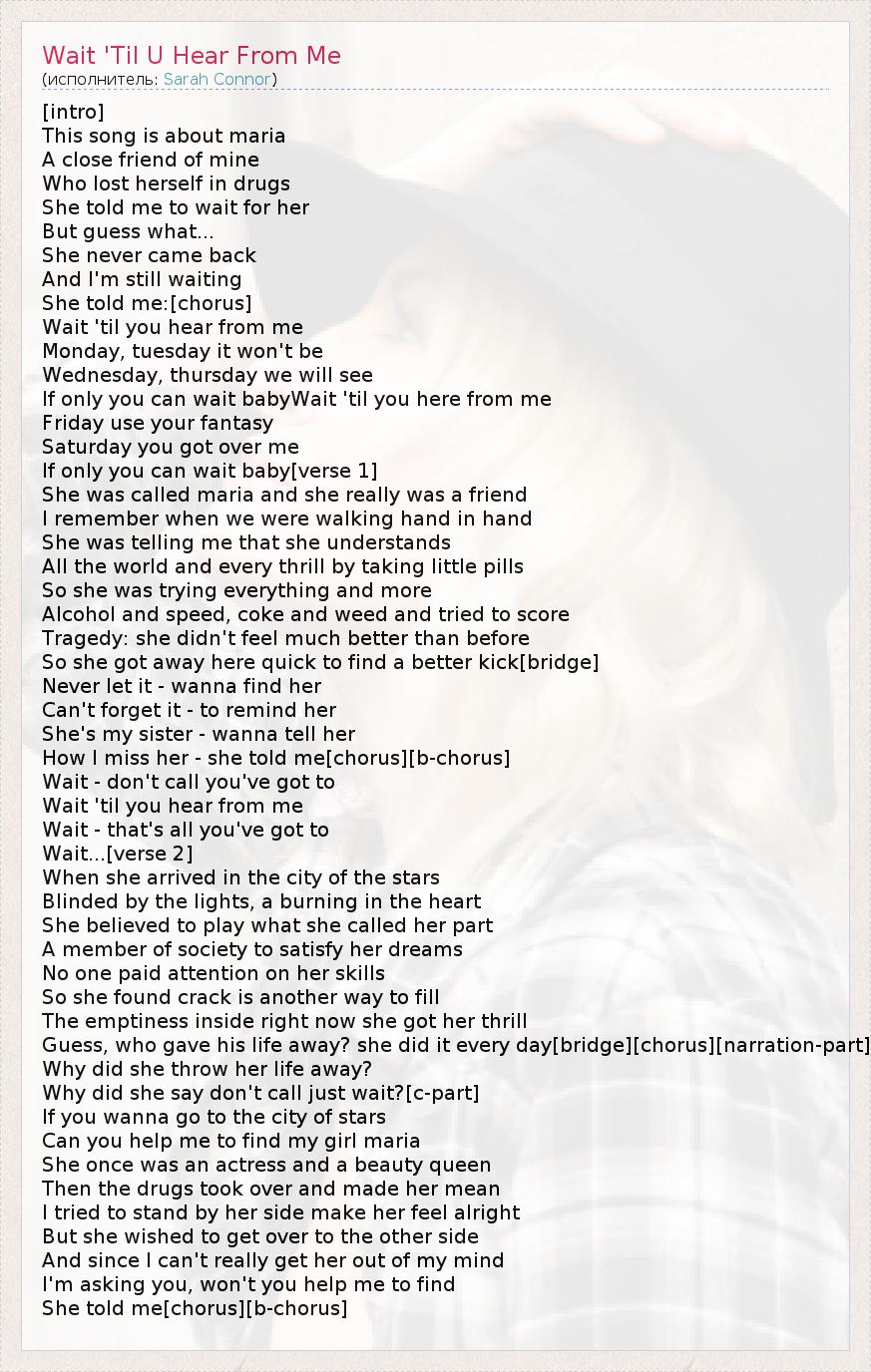 [intro] This song is about maria A close friend of mine Who lost herself in drugs She told me to wait for her But guess what... She never came back And I'm still waiting She told me:[chorus] Wait 'til you hear from me Monday, tuesday it won't be Wednesday, thursday we will see If only you can wait babyWait 'til you here from me Friday use your fantasy Saturday you got over me If only you can wait baby[verse 1] She was called maria and she really was a friend I remember when we were walking hand in hand She was telling me that she understands All the world and every thrill by taking little pills So she was trying everything and more Alcohol and speed, coke and weed and tried to score Tragedy: she didn't feel much better than before So she got away here quick to find a better kick[bridge] Never let it - wanna find her Can't forget it - to remind her She's my sister - wanna tell her How I miss her - she told me[chorus][b-chorus] Wait - don't call you've got to Wait 'til you hear from me Wait - that's all you've got to Wait...[verse 2] When she arrived in the city of the stars Blinded by the lights, a burning in the heart She believed to play what she called her part A member of society to satisfy her dreams No one paid attention on her skills So she found crack is another way to fill The emptiness inside right now she got her thrill Guess, who gave his life away? she did it every day[bridge][chorus][narration-part] Why did she throw her life away? Why did she say don't call just wait?[c-part] If you wanna go to the city of stars Can you help me to find my girl maria She once was an actress and a beauty queen Then the drugs took over and made her mean I tried to stand by her side make her feel alright But she wished to get over to the other side And since I can't really get her out of my mind I'm asking you, won't you help me to find She told me[chorus][b-chorus]
