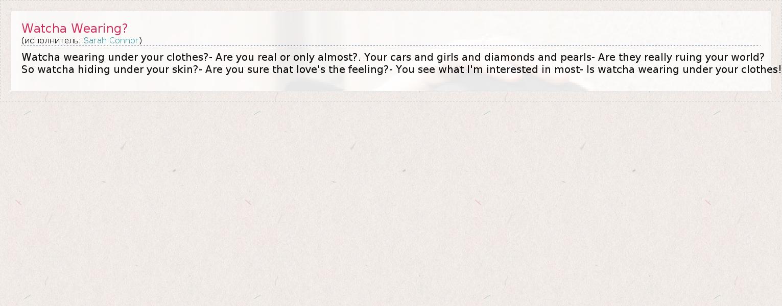 Watcha wearing under your clothes?- Are you real or only almost?. Your cars and girls and diamonds and pearls- Are they really ruing your world? So watcha hiding under your skin?- Are you sure that love's the feeling?- You see what I'm interested in most- Is watcha wearing under your clothes!