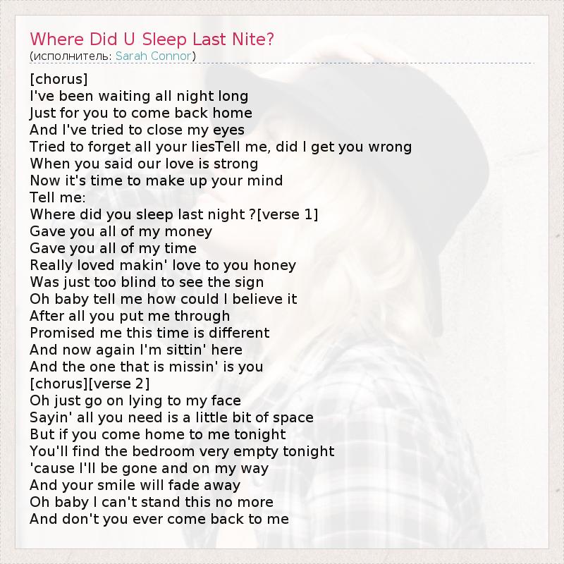 ГлавнаяИсполнителиSarah ConnorWhere Did U Sleep Last Nite?