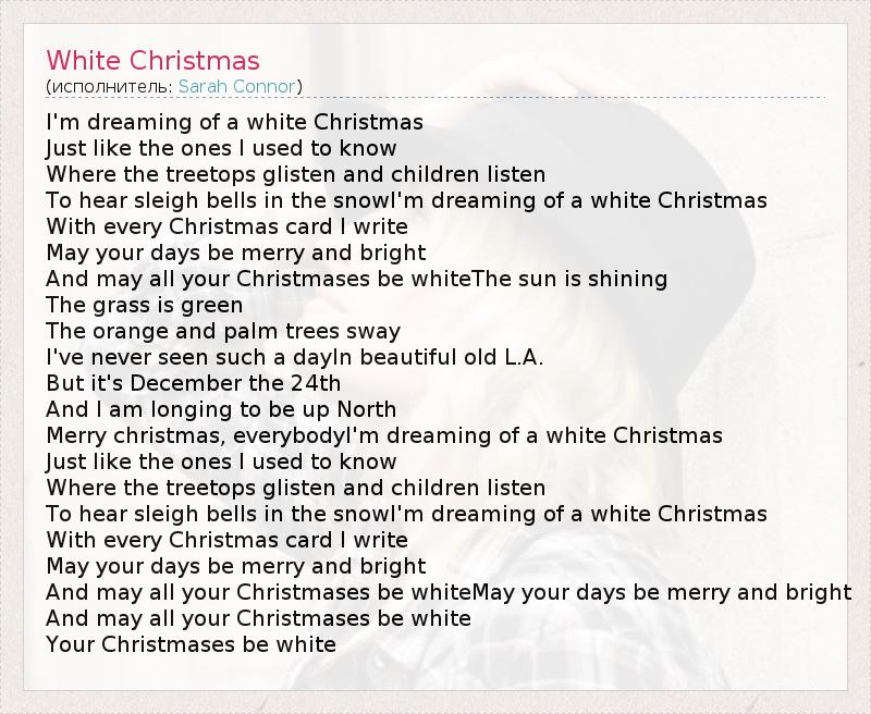 I'm dreaming of a white Christmas Just like the ones I used to know Where the treetops glisten and children listen To hear sleigh bells in the snowI'm dreaming of a white Christmas With every Christmas card I write May your days be merry and bright And may all your Christmases be whiteThe sun is shining The grass is green The orange and palm trees sway I've never seen such a dayIn beautiful old L.A. But it's December the 24th And I am longing to be up North Merry christmas, everybodyI'm dreaming of a white Christmas Just like the ones I used to know Where the treetops glisten and children listen To hear sleigh bells in the snowI'm dreaming of a white Christmas With every Christmas card I write May your days be merry and bright And may all your Christmases be whiteMay your days be merry and bright And may all your Christmases be white Your Christmases be white