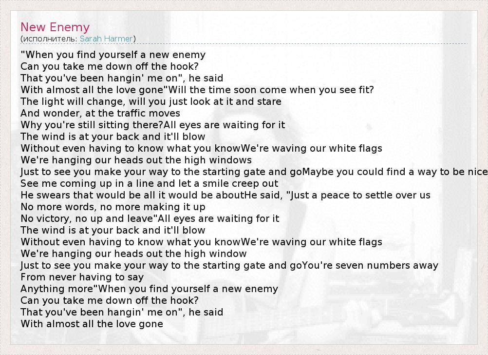 "When you find yourself a new enemy Can you take me down off the hook? That you've been hangin' me on", he said With almost all the love gone"Will the time soon come when you see fit? The light will change, will you just look at it and stare And wonder, at the traffic moves Why you're still sitting there?All eyes are waiting for it The wind is at your back and it'll blow Without even having to know what you knowWe're waving our white flags We're hanging our heads out the high windows Just to see you make your way to the starting gate and goMaybe you could find a way to be nice See me coming up in a line and let a smile creep out He swears that would be all it would be aboutHe said, "Just a peace to settle over us No more words, no more making it up No victory, no up and leave"All eyes are waiting for it The wind is at your back and it'll blow Without even having to know what you knowWe're waving our white flags We're hanging our heads out the high window Just to see you make your way to the starting gate and goYou're seven numbers away From never having to say Anything more"When you find yourself a new enemy Can you take me down off the hook? That you've been hangin' me on", he said With almost all the love gone