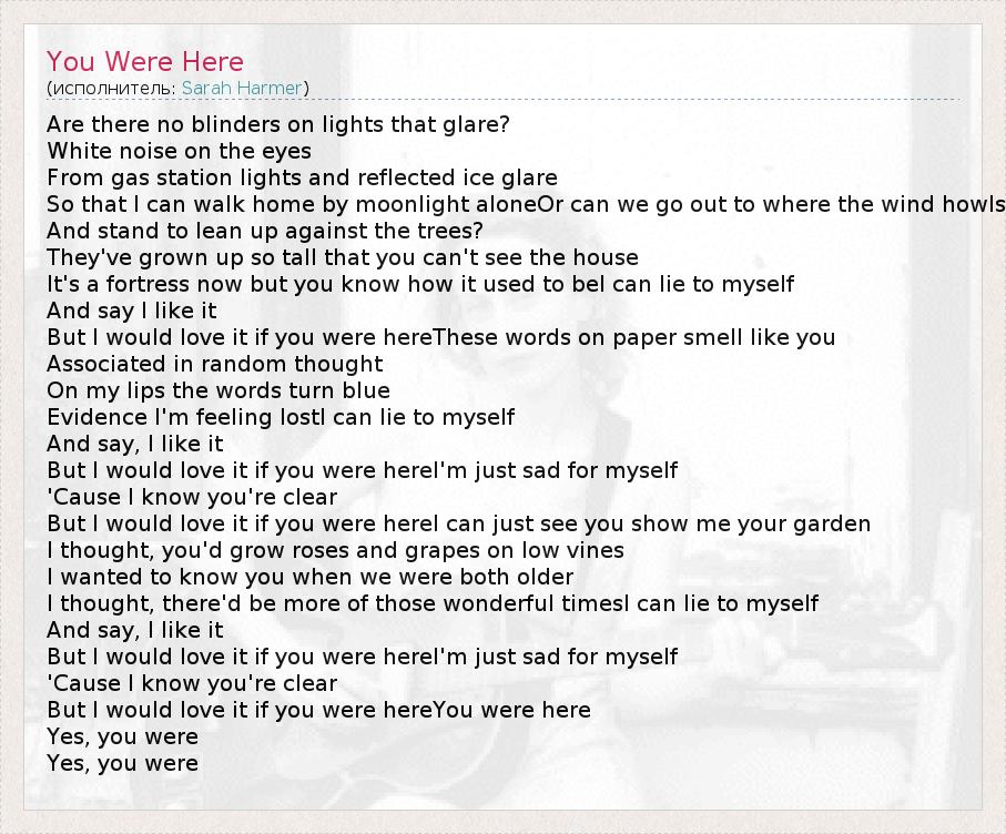 Are there no blinders on lights that glare? White noise on the eyes From gas station lights and reflected ice glare So that I can walk home by moonlight aloneOr can we go out to where the wind howls And stand to lean up against the trees? They've grown up so tall that you can't see the house It's a fortress now but you know how it used to beI can lie to myself And say I like it But I would love it if you were hereThese words on paper smell like you Associated in random thought On my lips the words turn blue Evidence I'm feeling lostI can lie to myself And say, I like it But I would love it if you were hereI'm just sad for myself 'Cause I know you're clear But I would love it if you were hereI can just see you show me your garden I thought, you'd grow roses and grapes on low vines I wanted to know you when we were both older I thought, there'd be more of those wonderful timesI can lie to myself And say, I like it But I would love it if you were hereI'm just sad for myself 'Cause I know you're clear But I would love it if you were hereYou were here Yes, you were Yes, you were