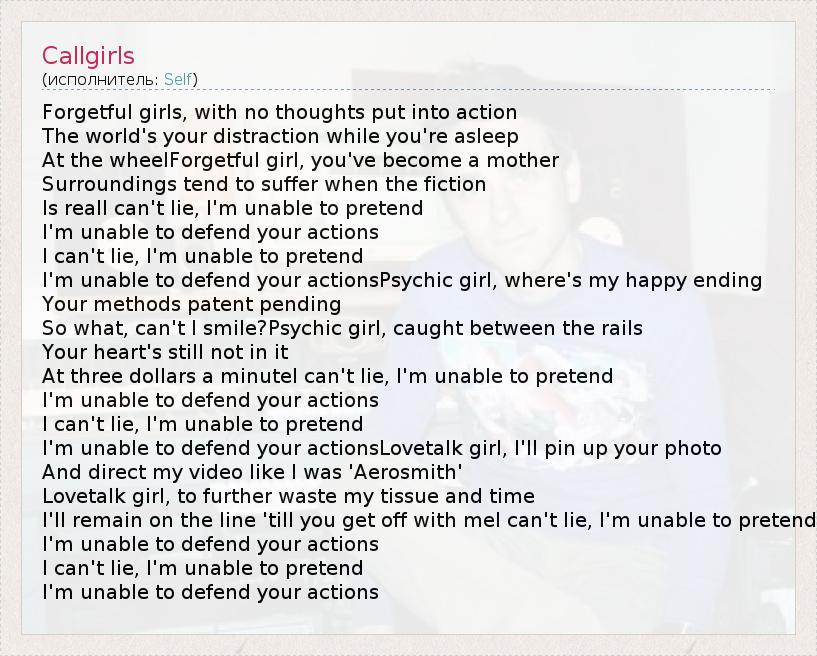 Forgetful girls, with no thoughts put into action The world's your distraction while you're asleep At the wheelForgetful girl, you've become a mother Surroundings tend to suffer when the fiction Is realI can't lie, I'm unable to pretend I'm unable to defend your actions I can't lie, I'm unable to pretend I'm unable to defend your actionsPsychic girl, where's my happy ending Your methods patent pending So what, can't I smile?Psychic girl, caught between the rails Your heart's still not in it At three dollars a minuteI can't lie, I'm unable to pretend I'm unable to defend your actions I can't lie, I'm unable to pretend I'm unable to defend your actionsLovetalk girl, I'll pin up your photo And direct my video like I was 'Aerosmith' Lovetalk girl, to further waste my tissue and time I'll remain on the line 'till you get off with meI can't lie, I'm unable to pretend I'm unable to defend your actions I can't lie, I'm unable to pretend I'm unable to defend your actions