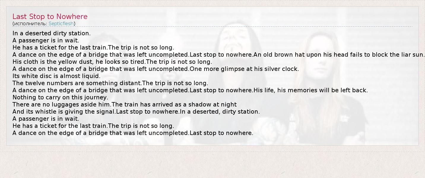 In a deserted dirty station. A passenger is in wait. He has a ticket for the last train.The trip is not so long. A dance on the edge of a bridge that was left uncompleted.Last stop to nowhere.An old brown hat upon his head fails to block the liar sun. His cloth is the yellow dust, he looks so tired.The trip is not so long. A dance on the edge of a bridge that was left uncompleted.One more glimpse at his silver clock. Its white disc is almost liquid. The twelve numbers are something distant.The trip is not so long. A dance on the edge of a bridge that was left uncompleted.Last stop to nowhere.His life, his memories will be left back. Nothing to carry on this journey. There are no luggages aside him.The train has arrived as a shadow at night And its whistle is giving the signal.Last stop to nowhere.In a deserted, dirty station. A passenger is in wait. He has a ticket for the last train.The trip is not so long. A dance on the edge of a bridge that was left uncompleted.Last stop to nowhere.