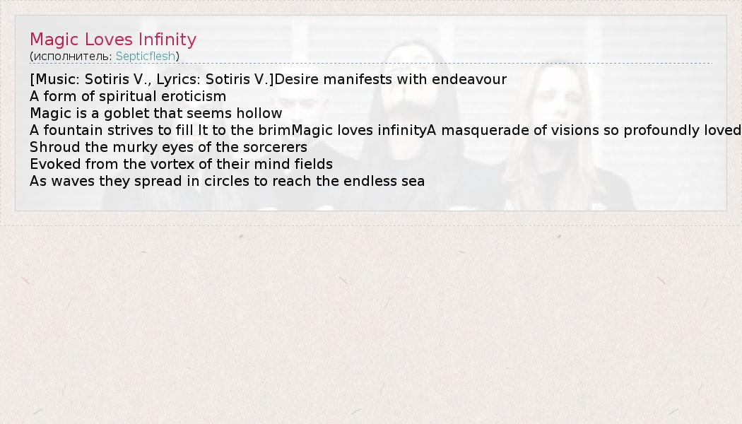[Music: Sotiris V., Lyrics: Sotiris V.]Desire manifests with endeavour A form of spiritual eroticism Magic is a goblet that seems hollow A fountain strives to fill It to the brimMagic loves infinityA masquerade of visions so profoundly loved Shroud the murky eyes of the sorcerers Evoked from the vortex of their mind fields As waves they spread in circles to reach the endless sea