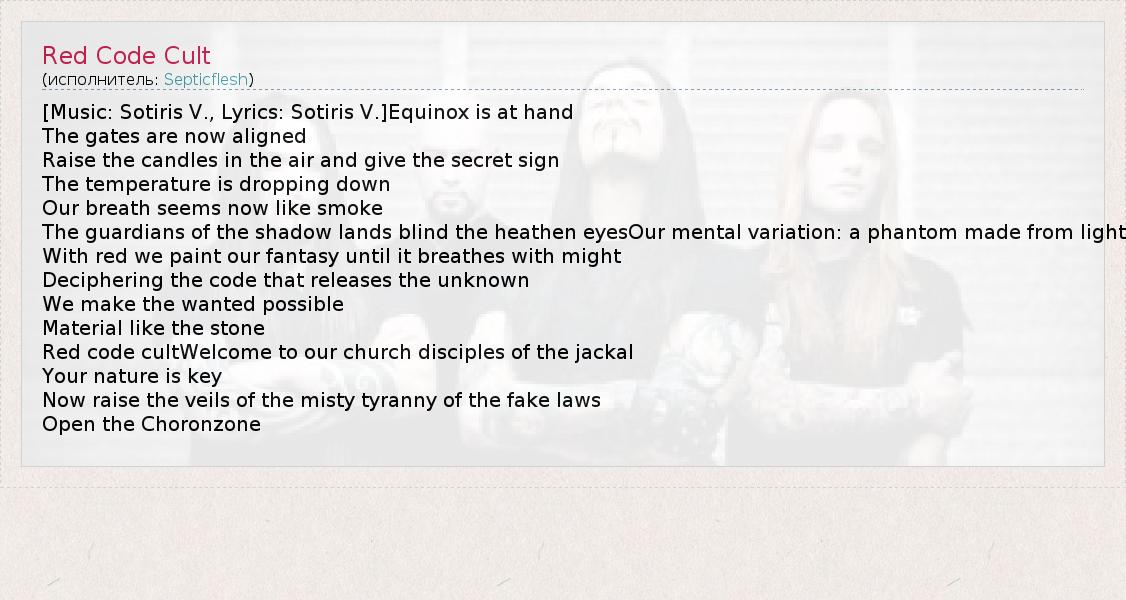 [Music: Sotiris V., Lyrics: Sotiris V.]Equinox is at hand The gates are now aligned Raise the candles in the air and give the secret sign The temperature is dropping down Our breath seems now like smoke The guardians of the shadow lands blind the heathen eyesOur mental variation: a phantom made from light With red we paint our fantasy until it breathes with might Deciphering the code that releases the unknown We make the wanted possible Material like the stone Red code cultWelcome to our church disciples of the jackal Your nature is key Now raise the veils of the misty tyranny of the fake laws Open the Choronzone