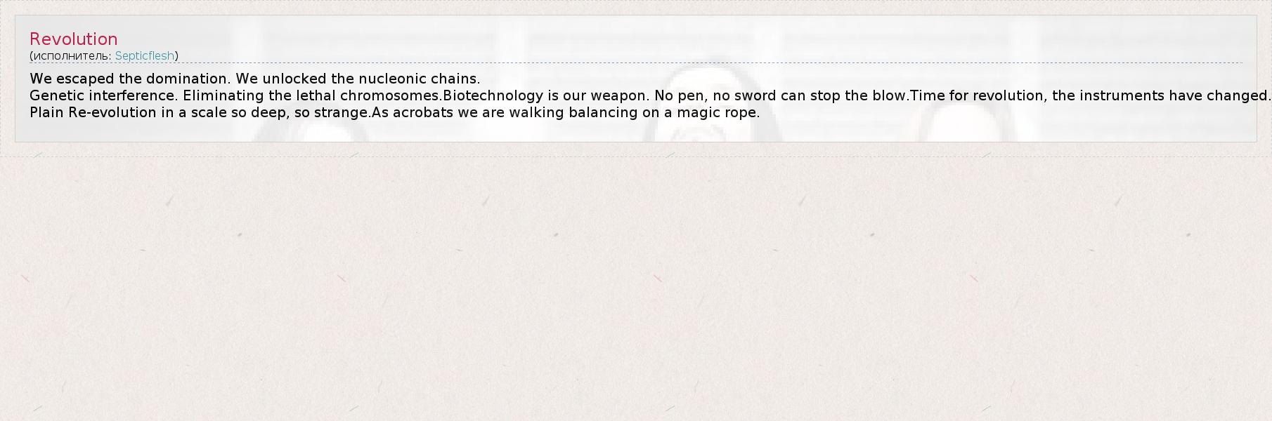 We escaped the domination. We unlocked the nucleonic chains. Genetic interference. Eliminating the lethal chromosomes.Biotechnology is our weapon. No pen, no sword can stop the blow.Time for revolution, the instruments have changed. Plain Re-evolution in a scale so deep, so strange.As acrobats we are walking balancing on a magic rope.