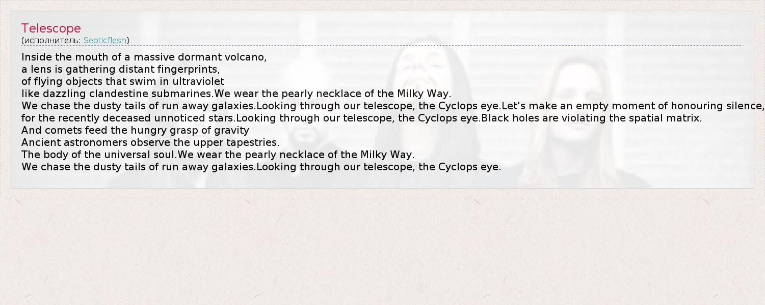 Inside the mouth of a massive dormant volcano, a lens is gathering distant fingerprints, of flying objects that swim in ultraviolet like dazzling clandestine submarines.We wear the pearly necklace of the Milky Way. We chase the dusty tails of run away galaxies.Looking through our telescope, the Cyclops eye.Let's make an empty moment of honouring silence, for the recently deceased unnoticed stars.Looking through our telescope, the Cyclops eye.Black holes are violating the spatial matrix. And comets feed the hungry grasp of gravity Ancient astronomers observe the upper tapestries. The body of the universal soul.We wear the pearly necklace of the Milky Way. We chase the dusty tails of run away galaxies.Looking through our telescope, the Cyclops eye.