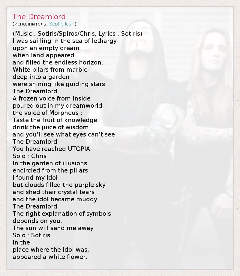 (Music : Sotiris/Spiros/Chris, Lyrics : Sotiris) I was sailling in the sea of lethargy upon an empty dream when land appeared and filled the endless horizon. White pilars from marble deep into a garden were shining like guiding stars. The Dreamlord A frozen voice from inside poured out in my dreamworld the voice of Morpheus : Taste the fruit of knowledge drink the juice of wisdom and you'll see what eyes can't see The Dreamlord You have reached UTOPIA Solo : Chris In the garden of illusions encircled from the pillars I found my idol but clouds filled the purple sky and shed their crystal tears and the idol became muddy. The Dreamlord The right explanation of symbols depends on you. The sun will send me away Solo : Sotiris In the place where the idol was, appeared a white flower.