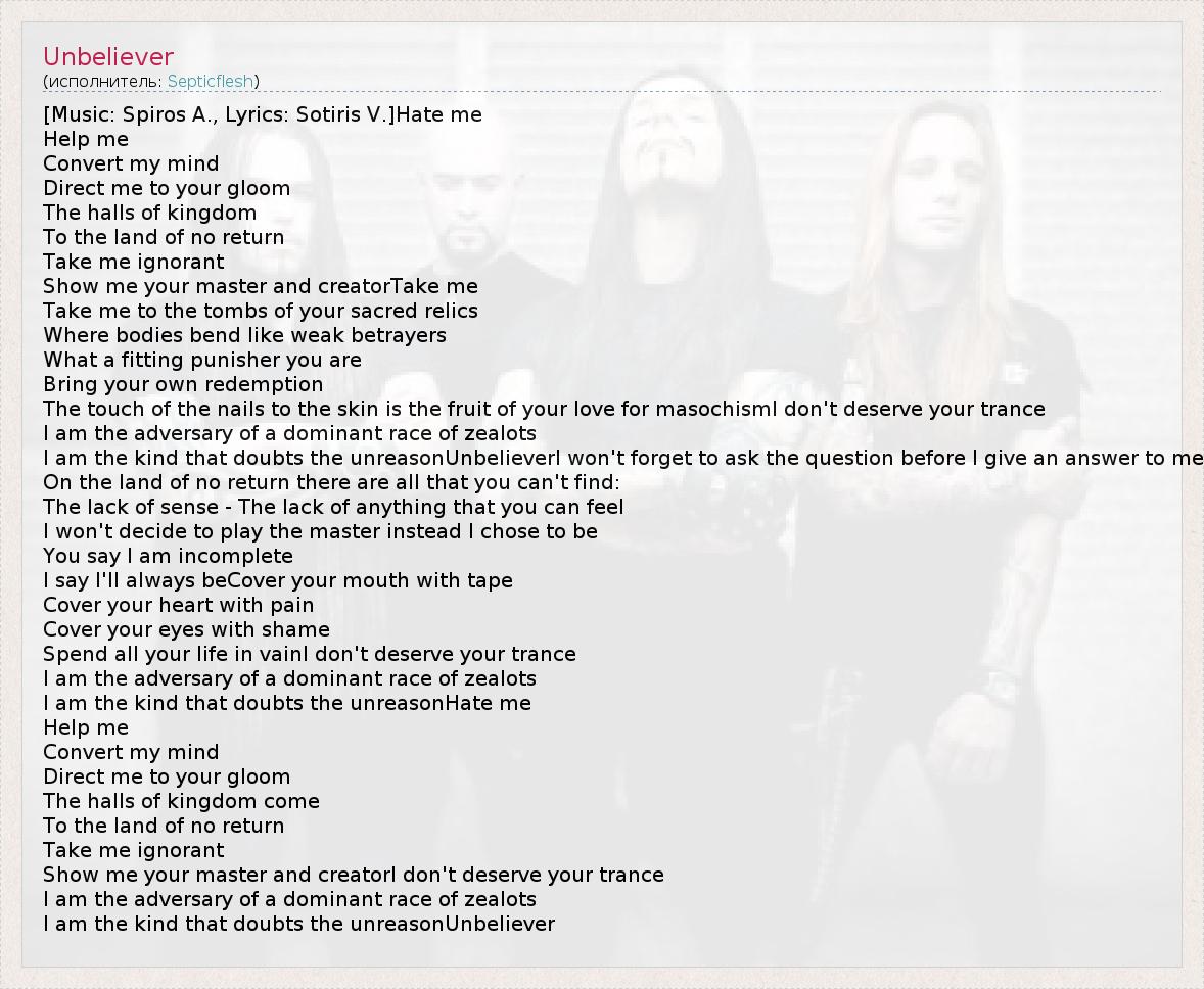 [Music: Spiros A., Lyrics: Sotiris V.]Hate me Help me Convert my mind Direct me to your gloom The halls of kingdom To the land of no return Take me ignorant Show me your master and creatorTake me Take me to the tombs of your sacred relics Where bodies bend like weak betrayers What a fitting punisher you are Bring your own redemption The touch of the nails to the skin is the fruit of your love for masochismI don't deserve your trance I am the adversary of a dominant race of zealots I am the kind that doubts the unreasonUnbelieverI won't forget to ask the question before I give an answer to me On the land of no return there are all that you can't find: The lack of sense - The lack of anything that you can feel I won't decide to play the master instead I chose to be You say I am incomplete I say I'll always beCover your mouth with tape Cover your heart with pain Cover your eyes with shame Spend all your life in vainI don't deserve your trance I am the adversary of a dominant race of zealots I am the kind that doubts the unreasonHate me Help me Convert my mind Direct me to your gloom The halls of kingdom come To the land of no return Take me ignorant Show me your master and creatorI don't deserve your trance I am the adversary of a dominant race of zealots I am the kind that doubts the unreasonUnbeliever