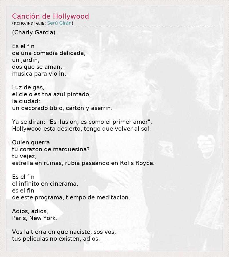 (Charly Garcia) Es el fin de una comedia delicada, un jardin, dos que se aman, musica para violin. Luz de gas, el cielo es tna azul pintado, la ciudad: un decorado tibio, carton y aserrin. Ya se diran: "Es ilusion, es como el primer amor", Hollywood esta desierto, tengo que volver al sol. Quien querra tu corazon de marquesina? tu vejez, estrella en ruinas, rubia paseando en Rolls Royce. Es el fin el infinito en cinerama, es el fin de este programa, tiempo de meditacion. Adios, adios, Paris, New York. Ves la tierra en que naciste, sos vos, tus peliculas no existen, adios.