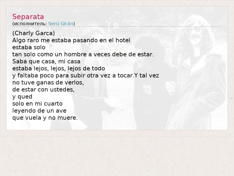 (Charly Garca) Algo raro me estaba pasando en el hotel estaba solo tan solo como un hombre a veces debe de estar. Saba que casa, mi casa estaba lejos, lejos, lejos de todo y faltaba poco para subir otra vez a tocar.Y tal vez no tuve ganas de verlos, de estar con ustedes, y qued solo en mi cuarto leyendo de un ave que vuela y no muere.
