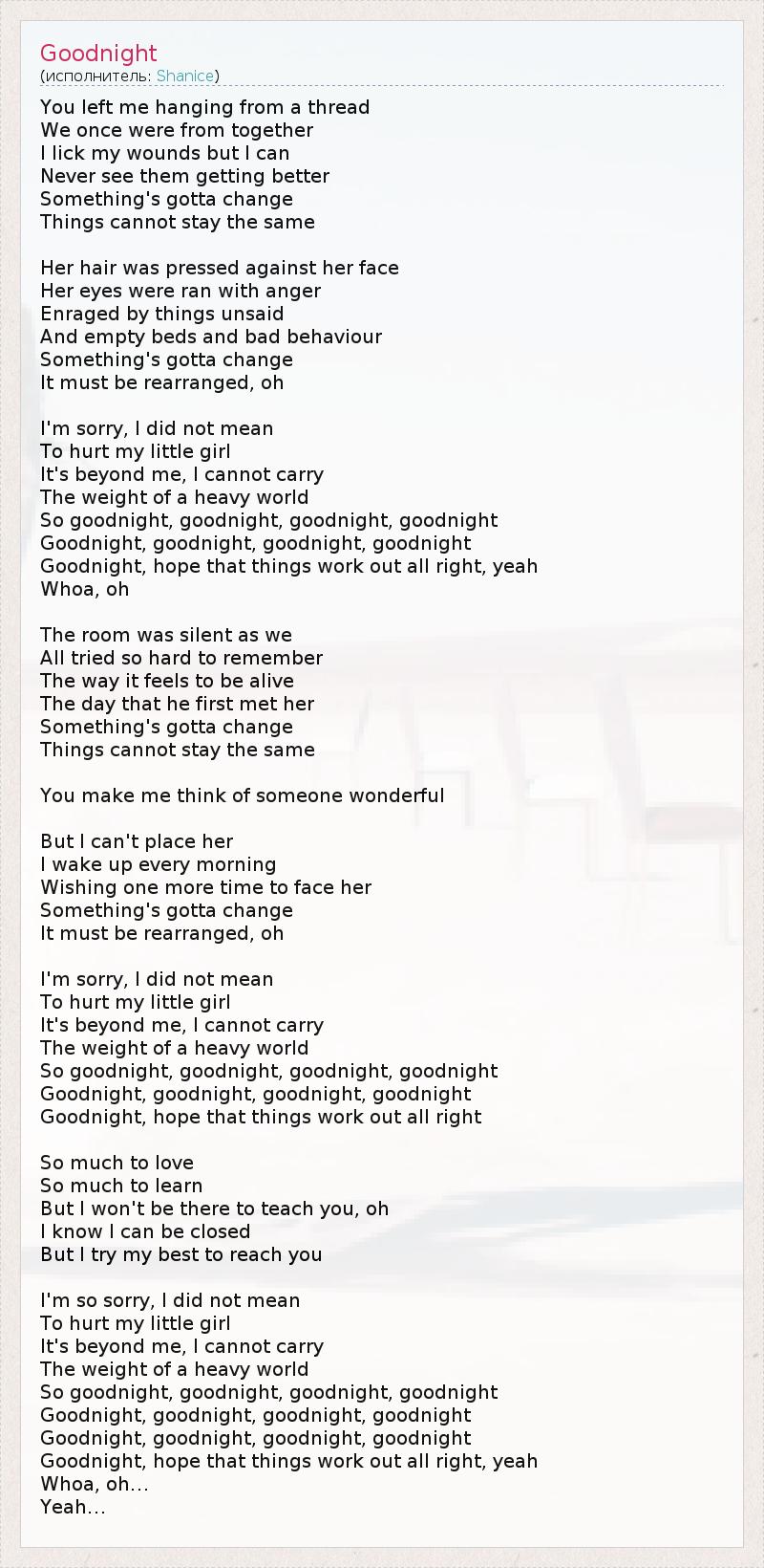 Ты оставила висеть меня на той нити, На которой мы когда-то были вместе. Я зализываю раны, Но не чувствую облегчения – Что-то придётся менять, Ничто не может остаться прежним. Её волосы прилегали к лицу, А глаза горели яростью: Она была разгневана даже тем, что не было сказано. Пустая кровать и плохое поведение... Что-то должно измениться, Придётся что-то менять! Мне так жаль, я не хотел Ранить мою маленькую девочку, Но это сильнее меня, я тоже не могу вынести Всю тяжесть этого мира Так доброй ночи, доброй ночи, Доброй ночи, доброй ночи, Доброй ночи, доброй ночи...Надеюсь, что всё ещё будет хорошо, О, да... Всё в комнате замолкло, пока мы Все силились вспомнить То чувство, когда понимаешь, что ты жив, И тот день, когда он впервые увидел её... Что-то придётся менять, Ничто не может остаться прежним. Ты напоминаешь мне о ком-то прекрасном... Но я не могу выбросить её из головы, Встаю каждое утро, Желая хотя бы раз увидеть её лицо... Что-то придётся менять, Ничто не может остаться прежним. Мне так жаль, я не хотел Ранить мою маленькую девочку, Но это сильнее меня, я тоже не могу вынести Всю тяжесть этого мира Так доброй ночи, доброй ночи, Доброй ночи, доброй ночи, Доброй ночи, доброй ночи...Надеюсь, что всё ещё будет хорошо, Мне ещё столько любить! И очень многому учиться! Меня не будет рядом и я не смогу ничему тебя научить. Я знаю, что мне придётся уйти, Но я приложу все усилия, чтобы тебя добиться! Мне так жаль, я не хотел Ранить мою маленькую девочку, Но это сильнее меня, я тоже не могу вынести Всю тяжесть этого мира Так доброй ночи, доброй ночи, Доброй ночи, доброй ночи, Доброй ночи, доброй ночи, Доброй ночи, доброй ночи...Надеюсь, что всё ещё будет хорошо, О, да... Да…