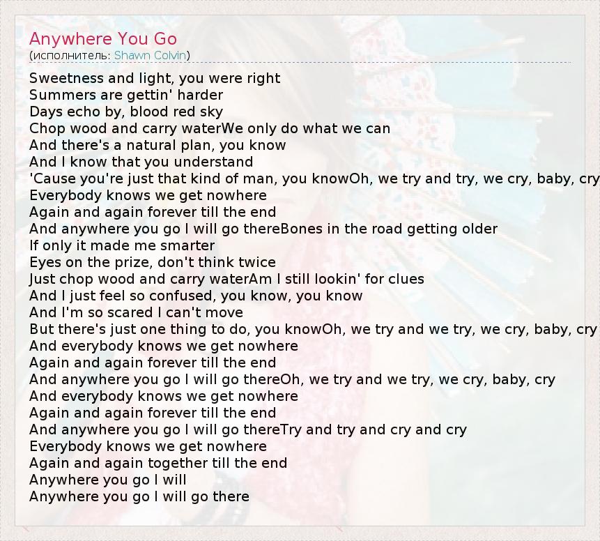 And anywhere you go I will go thereOh, we try and we try, we cry, baby, cry