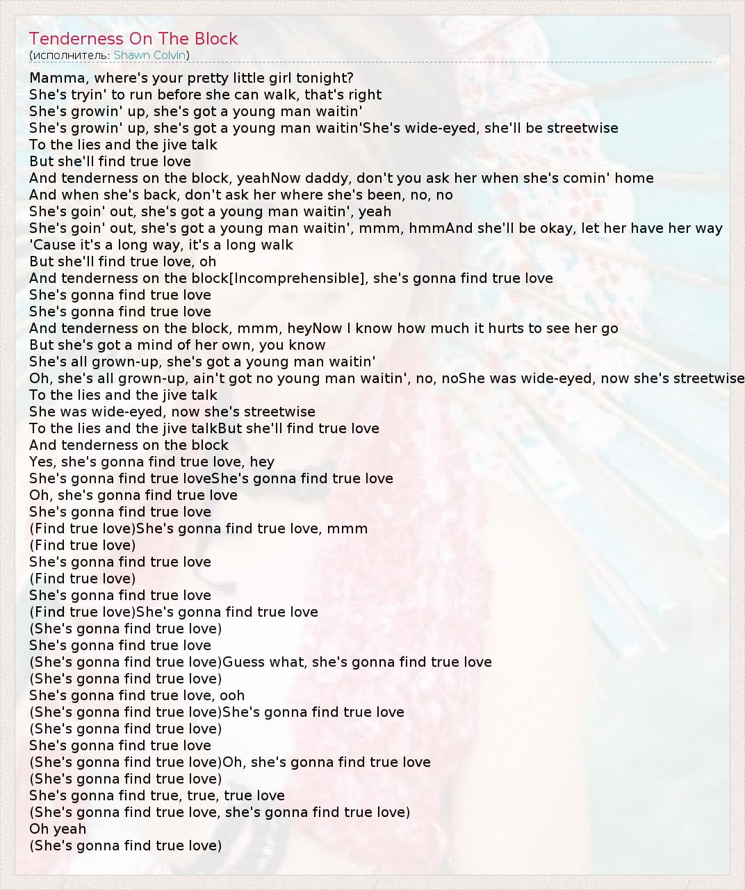 And tenderness on the block, yeahNow daddy, don't you ask her when she's comin' home