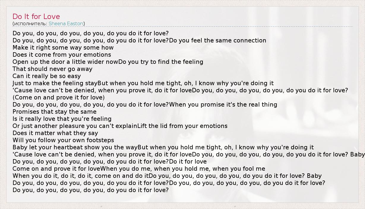 Do you, do you, do you, do you, do you do it for love? Do you, do you, do you, do you, do you do it for love?Do you feel the same connection Make it right some way some how Does it come from your emotions Open up the door a little wider nowDo you try to find the feeling That should never go away Can it really be so easy Just to make the feeling stayBut when you hold me tight, oh, I know why you're doing it 'Cause love can't be denied, when you prove it, do it for loveDo you, do you, do you, do you, do you do it for love? (Come on and prove it for love) Do you, do you, do you, do you, do you do it for love?When you promise it's the real thing Promises that stay the same Is it really love that you're feeling Or just another pleasure you can't explainLift the lid from your emotions Does it matter what they say Will you follow your own footsteps Baby let your heartbeat show you the wayBut when you hold me tight, oh, I know why you're doing it 'Cause love can't be denied, when you prove it, do it for loveDo you, do you, do you, do you, do you do it for love? Baby Do you, do you, do you, do you, do you do it for love?Do it for love Come on and prove it for loveWhen you do me, when you hold me, when you fool me When you do it, do it, do it, come on and do itDo you, do you, do you, do you, do you do it for love? Baby Do you, do you, do you, do you, do you do it for love?Do you, do you, do you, do you, do you do it for love? Do you, do you, do you, do you, do you do it for love?
