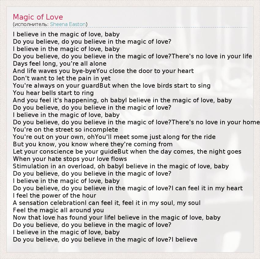 I believe in the magic of love, baby Do you believe, do you believe in the magic of love? I believe in the magic of love, baby Do you believe, do you believe in the magic of love?There's no love in your life Days feel long, you're all alone And life waves you bye-byeYou close the door to your heart Don't want to let the pain in yet You're always on your guardBut when the love birds start to sing You hear bells start to ring And you feel it's happening, oh babyI believe in the magic of love, baby Do you believe, do you believe in the magic of love? I believe in the magic of love, baby Do you believe, do you believe in the magic of love?There's no love in your home You're on the street so incomplete You're out on your own, ohYou'll meet some just along for the ride But you know, you know where they're coming from Let your conscience be your guideBut when the day comes, the night goes When your hate stops your love flows Stimulation in an overload, oh babyI believe in the magic of love, baby Do you believe, do you believe in the magic of love? I believe in the magic of love, baby Do you believe, do you believe in the magic of love?I can feel it in my heart I feel the power of the hour A sensation celebrationI can feel it, feel it in my soul, my soul Feel the magic all around you Now that love has found your lifeI believe in the magic of love, baby Do you believe, do you believe in the magic of love? I believe in the magic of love, baby Do you believe, do you believe in the magic of love?I believe