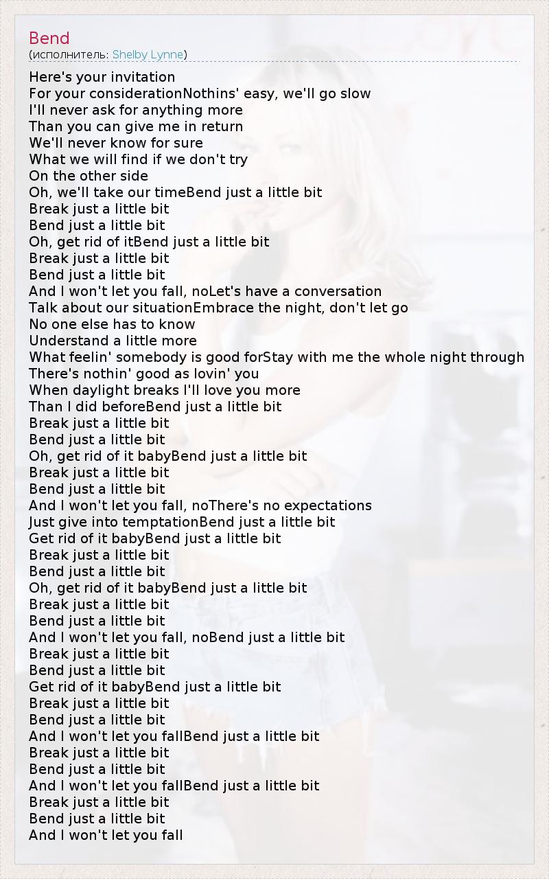 Here's your invitation For your considerationNothins' easy, we'll go slow I'll never ask for anything more Than you can give me in return We'll never know for sure What we will find if we don't try On the other side Oh, we'll take our timeBend just a little bit Break just a little bit Bend just a little bit Oh, get rid of itBend just a little bit Break just a little bit Bend just a little bit And I won't let you fall, noLet's have a conversation Talk about our situationEmbrace the night, don't let go No one else has to know Understand a little more What feelin' somebody is good forStay with me the whole night through There's nothin' good as lovin' you When daylight breaks I'll love you more Than I did beforeBend just a little bit Break just a little bit Bend just a little bit Oh, get rid of it babyBend just a little bit Break just a little bit Bend just a little bit And I won't let you fall, noThere's no expectations Just give into temptationBend just a little bit Get rid of it babyBend just a little bit Break just a little bit Bend just a little bit Oh, get rid of it babyBend just a little bit Break just a little bit Bend just a little bit And I won't let you fall, noBend just a little bit Break just a little bit Bend just a little bit Get rid of it babyBend just a little bit Break just a little bit Bend just a little bit And I won't let you fallBend just a little bit Break just a little bit Bend just a little bit And I won't let you fallBend just a little bit Break just a little bit Bend just a little bit And I won't let you fall