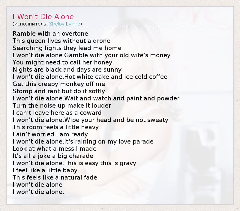 Ramble with an overtone This queen lives without a drone Searching lights they lead me home I won't die alone.Gamble with your old wife's money You might need to call her honey Nights are black and days are sunny I won't die alone.Hot white cake and ice cold coffee Get this creepy monkey off me Stomp and rant but do it softly I won't die alone.Wait and watch and paint and powder Turn the noise up make it louder I can't leave here as a coward I won't die alone.Wipe your head and be not sweaty This room feels a little heavy I ain't worried I am ready I won't die alone.It's raining on my love parade Look at what a mess I made It's all a joke a big charade I won't die alone.This is easy this is gravy I feel like a little baby This feels like a natural fade I won't die alone I won't die alone.