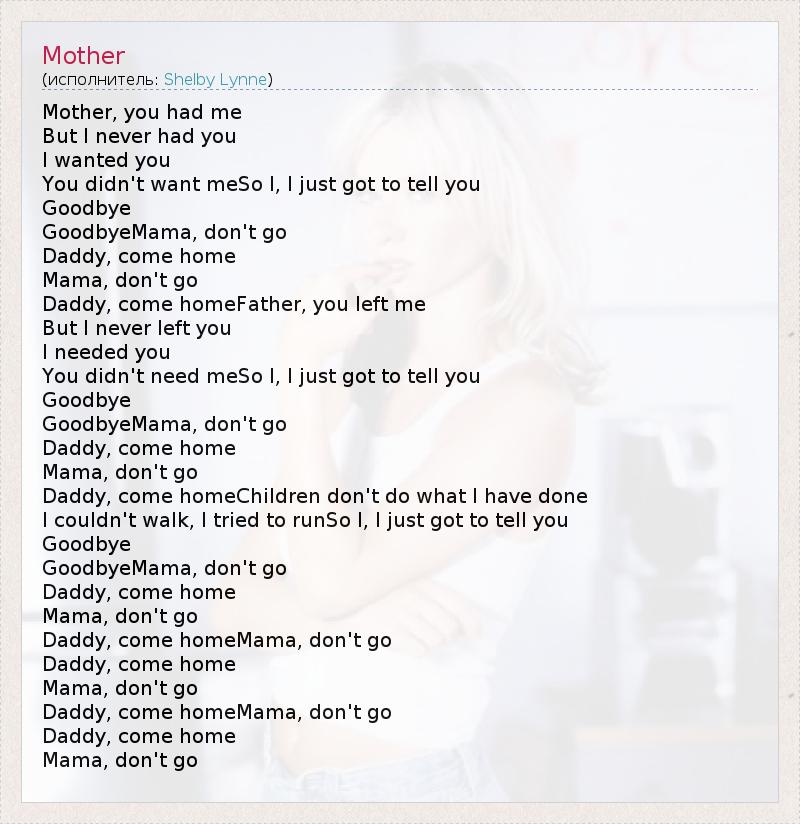 Mother, you had me But I never had you I wanted you You didn't want meSo I, I just got to tell you Goodbye GoodbyeMama, don't go Daddy, come home Mama, don't go Daddy, come homeFather, you left me But I never left you I needed you You didn't need meSo I, I just got to tell you Goodbye GoodbyeMama, don't go Daddy, come home Mama, don't go Daddy, come homeChildren don't do what I have done I couldn't walk, I tried to runSo I, I just got to tell you Goodbye GoodbyeMama, don't go Daddy, come home Mama, don't go Daddy, come homeMama, don't go Daddy, come home Mama, don't go Daddy, come homeMama, don't go Daddy, come home Mama, don't go