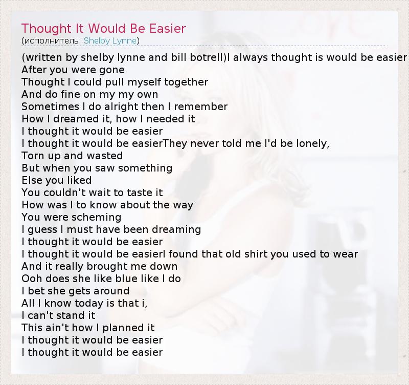 (written by shelby lynne and bill botrell)I always thought is would be easier After you were gone Thought I could pull myself together And do fine on my my own Sometimes I do alright then I remember How I dreamed it, how I needed it I thought it would be easier I thought it would be easierThey never told me I'd be lonely, Torn up and wasted But when you saw something Else you liked You couldn't wait to taste it How was I to know about the way You were scheming I guess I must have been dreaming I thought it would be easier I thought it would be easierI found that old shirt you used to wear And it really brought me down Ooh does she like blue like I do I bet she gets around All I know today is that i, I can't stand it This ain't how I planned it I thought it would be easier I thought it would be easier