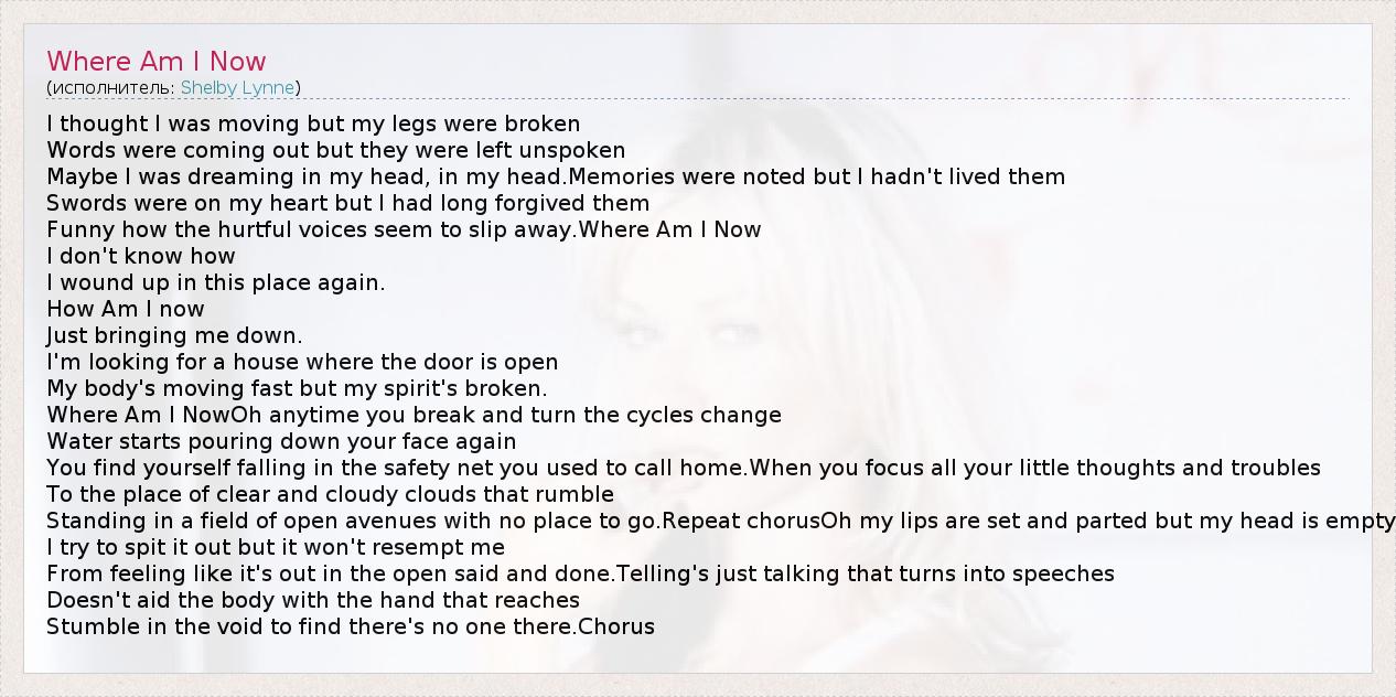 I thought I was moving but my legs were broken Words were coming out but they were left unspoken Maybe I was dreaming in my head, in my head.Memories were noted but I hadn't lived them Swords were on my heart but I had long forgived them Funny how the hurtful voices seem to slip away.Where Am I Now I don't know how I wound up in this place again. How Am I now Just bringing me down. I'm looking for a house where the door is open My body's moving fast but my spirit's broken. Where Am I NowOh anytime you break and turn the cycles change Water starts pouring down your face again You find yourself falling in the safety net you used to call home.When you focus all your little thoughts and troubles To the place of clear and cloudy clouds that rumble Standing in a field of open avenues with no place to go.Repeat chorusOh my lips are set and parted but my head is empty I try to spit it out but it won't resempt me From feeling like it's out in the open said and done.Telling's just talking that turns into speeches Doesn't aid the body with the hand that reaches Stumble in the void to find there's no one there.Chorus