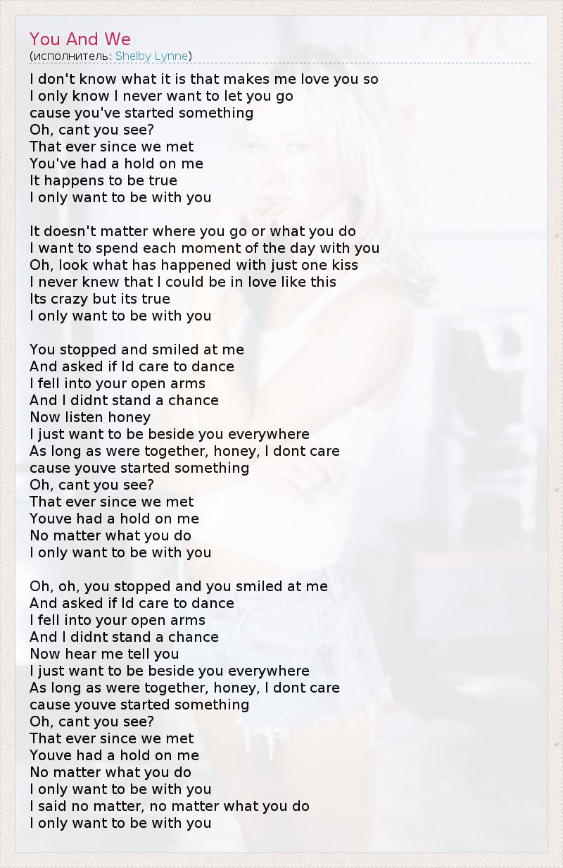 I don't know what it is that makes me love you so I only know I never want to let you go cause you've started something Oh, cant you see? That ever since we met You've had a hold on me It happens to be true I only want to be with you It doesn't matter where you go or what you do I want to spend each moment of the day with you Oh, look what has happened with just one kiss I never knew that I could be in love like this Its crazy but its true I only want to be with you You stopped and smiled at me And asked if Id care to dance I fell into your open arms And I didnt stand a chance Now listen honey I just want to be beside you everywhere As long as were together, honey, I dont care cause youve started something Oh, cant you see? That ever since we met Youve had a hold on me No matter what you do I only want to be with you Oh, oh, you stopped and you smiled at me And asked if Id care to dance I fell into your open arms And I didnt stand a chance Now hear me tell you I just want to be beside you everywhere As long as were together, honey, I dont care cause youve started something Oh, cant you see? That ever since we met Youve had a hold on me No matter what you do I only want to be with you I said no matter, no matter what you do I only want to be with you