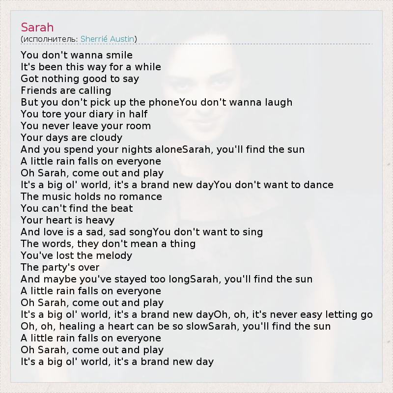 You don't wanna smile It's been this way for a while Got nothing good to say Friends are calling But you don't pick up the phoneYou don't wanna laugh You tore your diary in half You never leave your room Your days are cloudy And you spend your nights aloneSarah, you'll find the sun A little rain falls on everyone Oh Sarah, come out and play It's a big ol' world, it's a brand new dayYou don't want to dance The music holds no romance You can't find the beat Your heart is heavy And love is a sad, sad songYou don't want to sing The words, they don't mean a thing You've lost the melody The party's over And maybe you've stayed too longSarah, you'll find the sun A little rain falls on everyone Oh Sarah, come out and play It's a big ol' world, it's a brand new dayOh, oh, it's never easy letting go Oh, oh, healing a heart can be so slowSarah, you'll find the sun A little rain falls on everyone Oh Sarah, come out and play It's a big ol' world, it's a brand new day