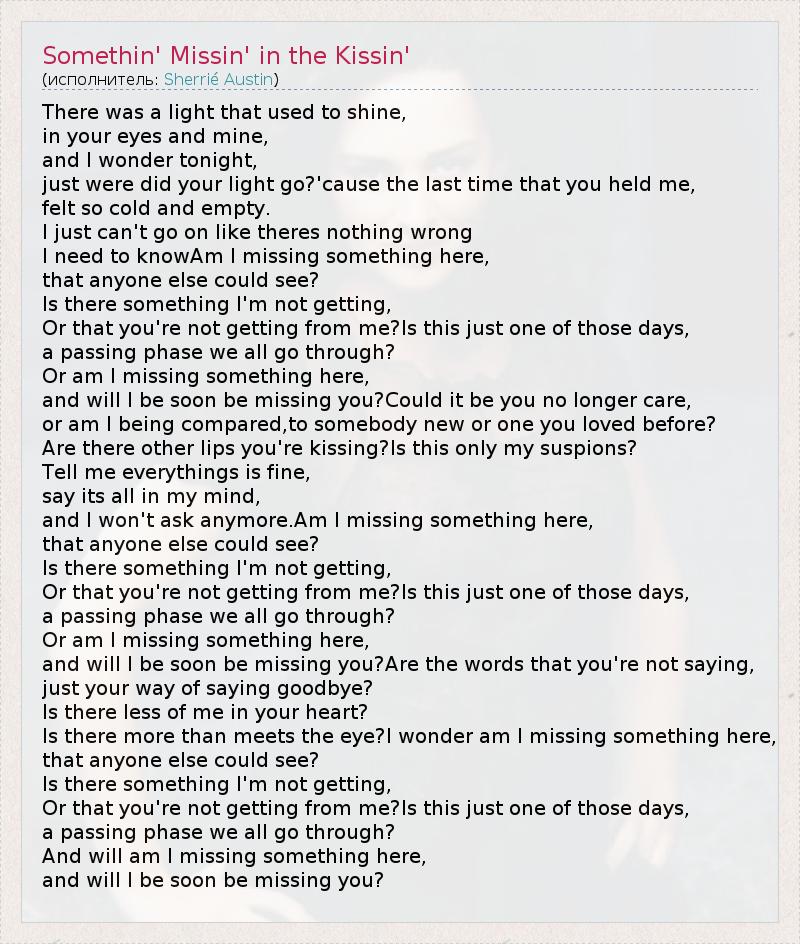 There was a light that used to shine, in your eyes and mine, and I wonder tonight, just were did your light go?'cause the last time that you held me, felt so cold and empty. I just can't go on like theres nothing wrong I need to knowAm I missing something here, that anyone else could see? Is there something I'm not getting, Or that you're not getting from me?Is this just one of those days, a passing phase we all go through? Or am I missing something here, and will I be soon be missing you?Could it be you no longer care, or am I being compared,to somebody new or one you loved before? Are there other lips you're kissing?Is this only my suspions? Tell me everythings is fine, say its all in my mind, and I won't ask anymore.Am I missing something here, that anyone else could see? Is there something I'm not getting, Or that you're not getting from me?Is this just one of those days, a passing phase we all go through? Or am I missing something here, and will I be soon be missing you?Are the words that you're not saying, just your way of saying goodbye? Is there less of me in your heart? Is there more than meets the eye?I wonder am I missing something here, that anyone else could see? Is there something I'm not getting, Or that you're not getting from me?Is this just one of those days, a passing phase we all go through? And will am I missing something here, and will I be soon be missing you?