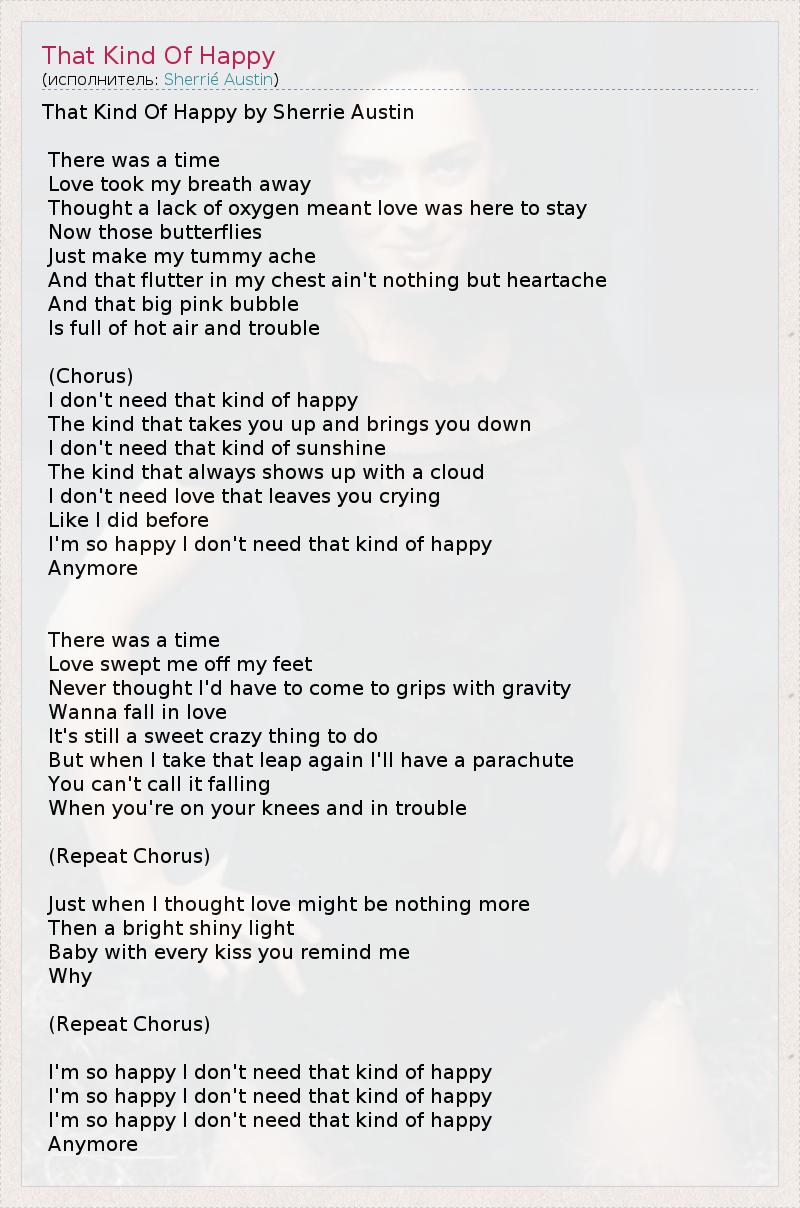 That Kind Of Happy by Sherrie Austin There was a time Love took my breath away Thought a lack of oxygen meant love was here to stay Now those butterflies Just make my tummy ache And that flutter in my chest ain't nothing but heartache And that big pink bubble Is full of hot air and trouble (Chorus) I don't need that kind of happy The kind that takes you up and brings you down I don't need that kind of sunshine The kind that always shows up with a cloud I don't need love that leaves you crying Like I did before I'm so happy I don't need that kind of happy Anymore There was a time Love swept me off my feet Never thought I'd have to come to grips with gravity Wanna fall in love It's still a sweet crazy thing to do But when I take that leap again I'll have a parachute You can't call it falling When you're on your knees and in trouble (Repeat Chorus) Just when I thought love might be nothing more Then a bright shiny light Baby with every kiss you remind me Why (Repeat Chorus) I'm so happy I don't need that kind of happy I'm so happy I don't need that kind of happy I'm so happy I don't need that kind of happy Anymore