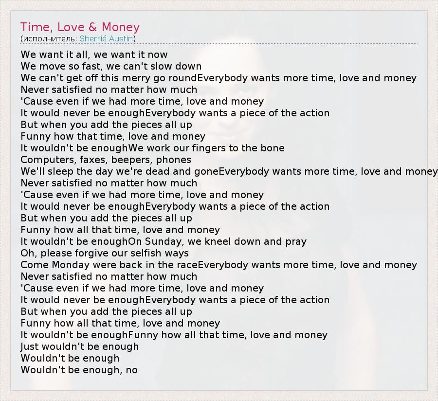 А как ты думаешь, о чем песня "Time, Love & Money" ?