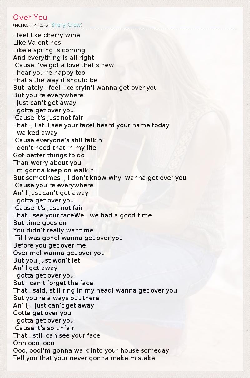 I feel like cherry wine Like Valentines Like a spring is coming And everything is all right 'Cause I've got a love that's new I hear you're happy too That's the way it should be But lately I feel like cryin'I wanna get over you But you're everywhere I just can't get away I gotta get over you 'Cause it's just not fair That I, I still see your faceI heard your name today I walked away 'Cause everyone's still talkin' I don't need that in my life Got better things to do Than worry about you I'm gonna keep on walkin' But sometimes I, I don't know whyI wanna get over you 'Cause you're everywhere An' I just can't get away I gotta get over you 'Cause it's just not fair That I see your faceWell we had a good time But time goes on You didn't really want me 'Til I was goneI wanna get over you Before you get over me Over meI wanna get over you But you just won't let An' I get away I gotta get over you But I can't forget the face That I said, still ring in my headI wanna get over you But you're always out there An' I, I just can't get away Gotta get over you I gotta get over you 'Cause it's so unfair That I still can see your face Ohh ooo, ooo Ooo, oooI'm gonna walk into your house someday Tell you that your never gonna make mistake