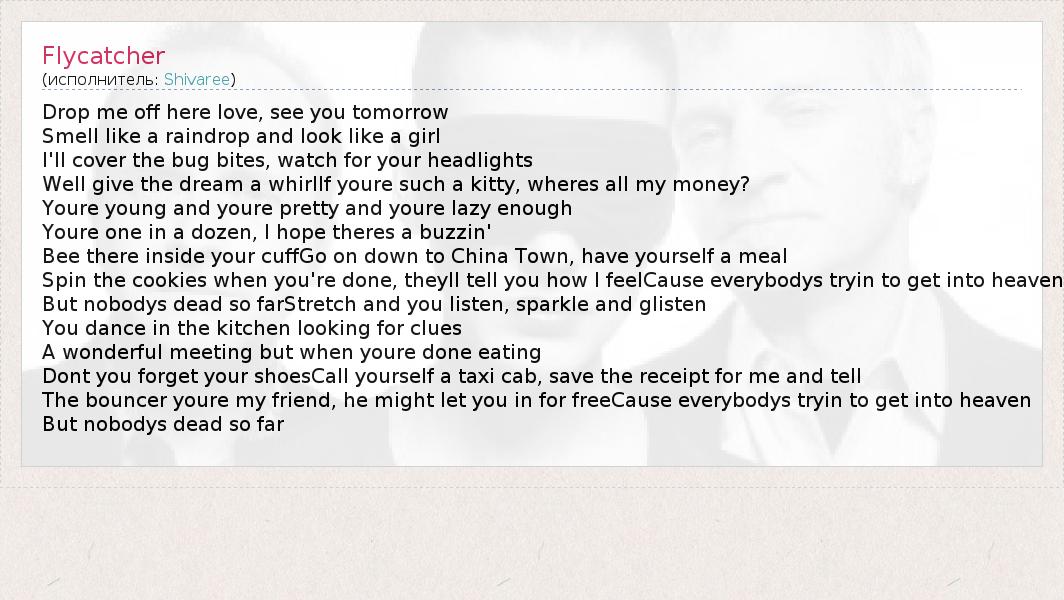 А как ты думаешь, о чем песня "Flycatcher" ?