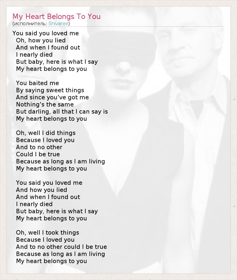 You said you loved me Oh, how you lied And when I found out I nearly died But baby, here is what I say My heart belongs to you You baited me By saying sweet things And since you've got me Nothing's the same But darling, all that I can say is My heart belongs to you Oh, well I did things Because I loved you And to no other Could I be true Because as long as I am living My heart belongs to you You said you loved me And how you lied And when I found out I nearly died But baby, here is what I say My heart belongs to you Oh, well I took things Because I loved you And to no other could I be true Because as long as I am living My heart belongs to you