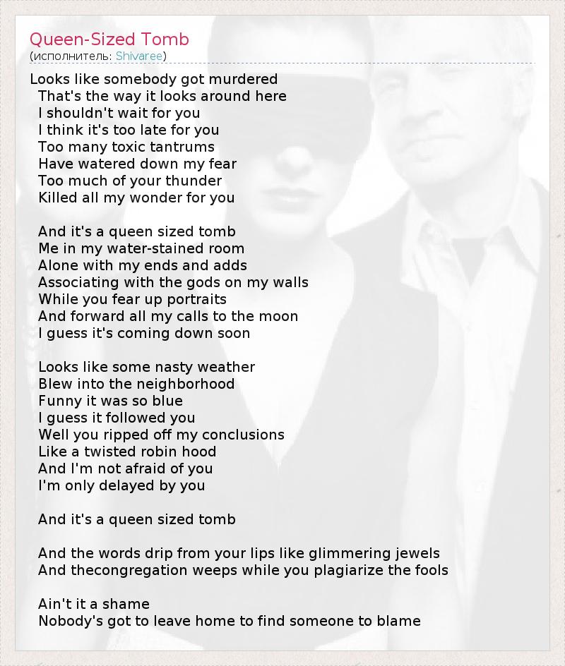 Looks like somebody got murdered That's the way it looks around here I shouldn't wait for you I think it's too late for you Too many toxic tantrums Have watered down my fear Too much of your thunder Killed all my wonder for you And it's a queen sized tomb Me in my water-stained room Alone with my ends and adds Associating with the gods on my walls While you fear up portraits And forward all my calls to the moon I guess it's coming down soon Looks like some nasty weather Blew into the neighborhood Funny it was so blue I guess it followed you Well you ripped off my conclusions Like a twisted robin hood And I'm not afraid of you I'm only delayed by you And it's a queen sized tomb And the words drip from your lips like glimmering jewels And thecongregation weeps while you plagiarize the fools Ain't it a shame Nobody's got to leave home to find someone to blame