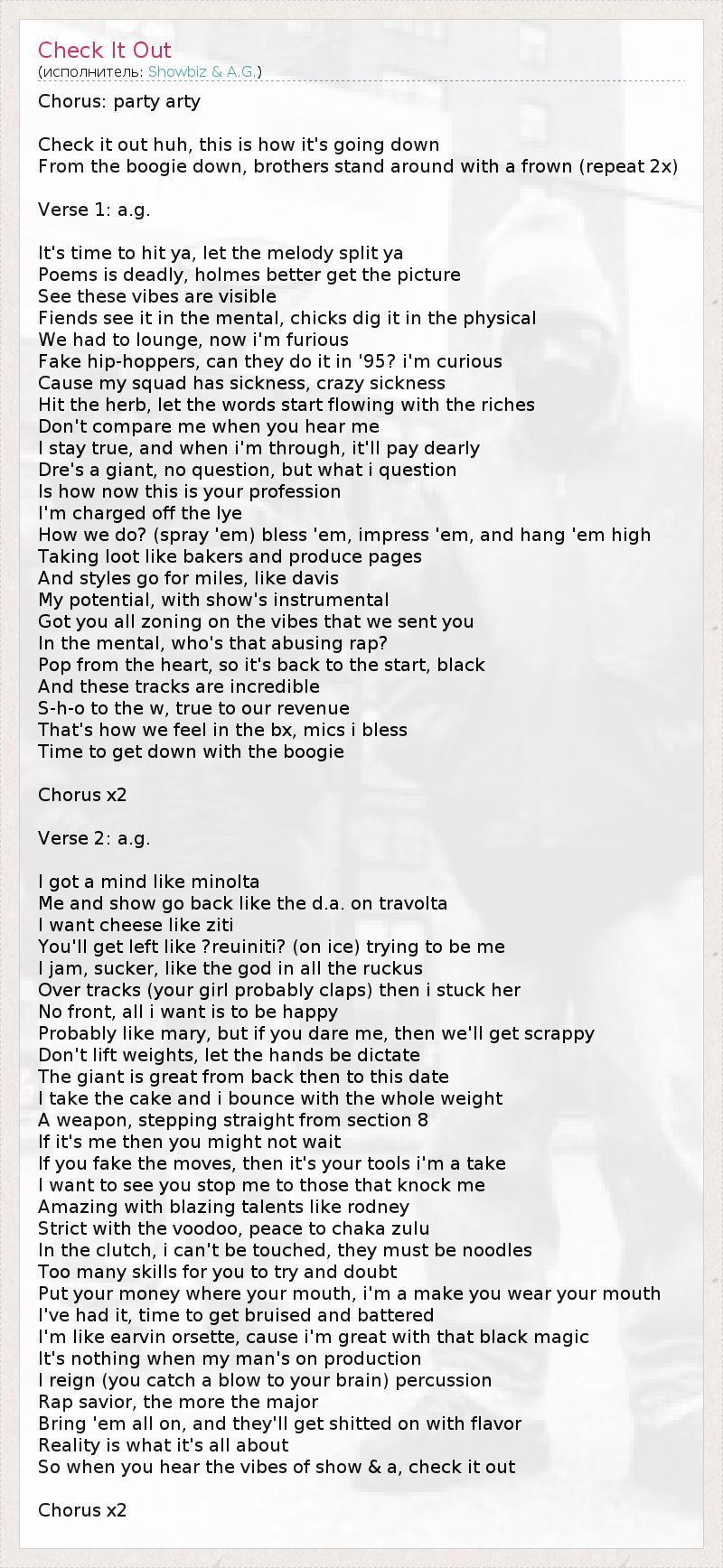 Это интересно:Showbiz & A.G. (так же известны как Show & A.G.) - американский хип-хоп дуэт из The Bronx, New York City. Showbiz - продюсер, A.G. (сокращенное от André the Giant) - рэпер. Впервые они засветились на альбоме Lord Finesse "Funky Technician" в 1990 году. Show & A.G. - участники легендарной команды Diggin' in the Crates (D.I.T.C.) вместе с Lord Finesse, Diamond D, Fat Joe, O.C., Buckwild и ныне покойным Big L. Первым полноценным релизом дуэта стал EP "Soul Clap", выпущенный в... продолжение